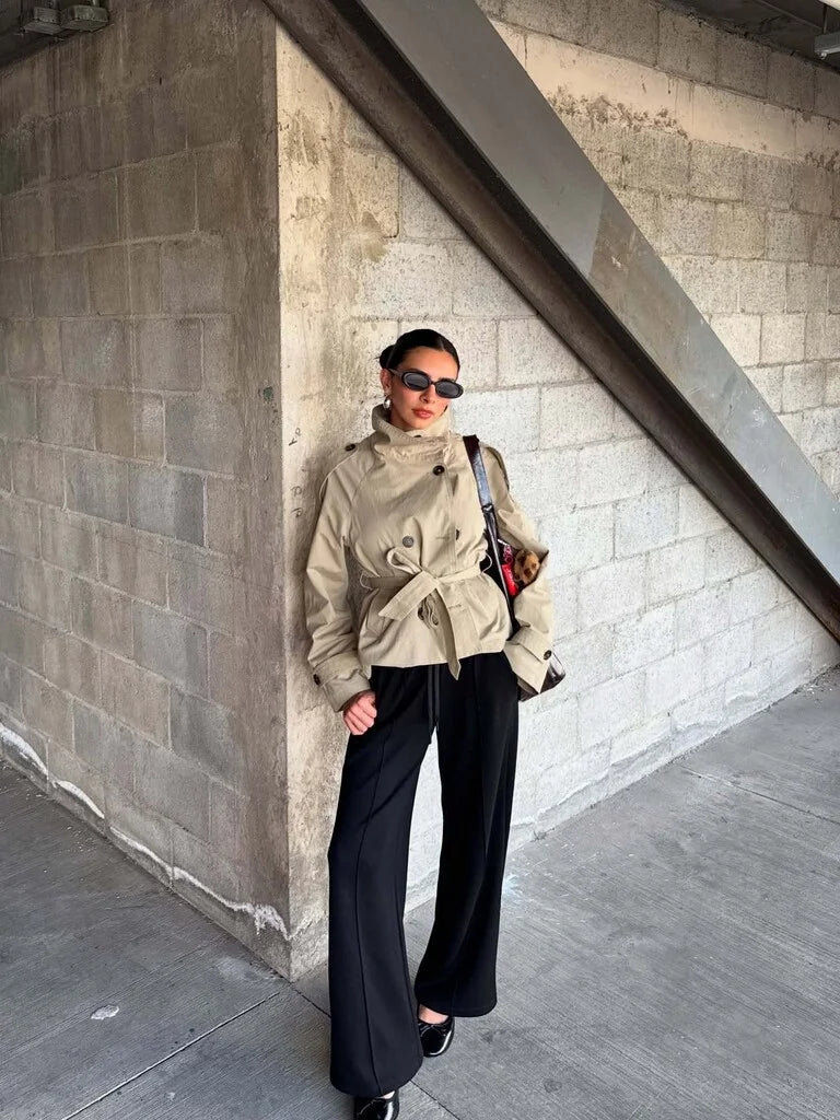 A refined cropped trench coat designed for effortless layering. Double-breasted style, elegant drape, and premium finish. Crafted with certified recycled and organic cotton, plus recycled polyester lining — where timeless fashion meets sustainability.